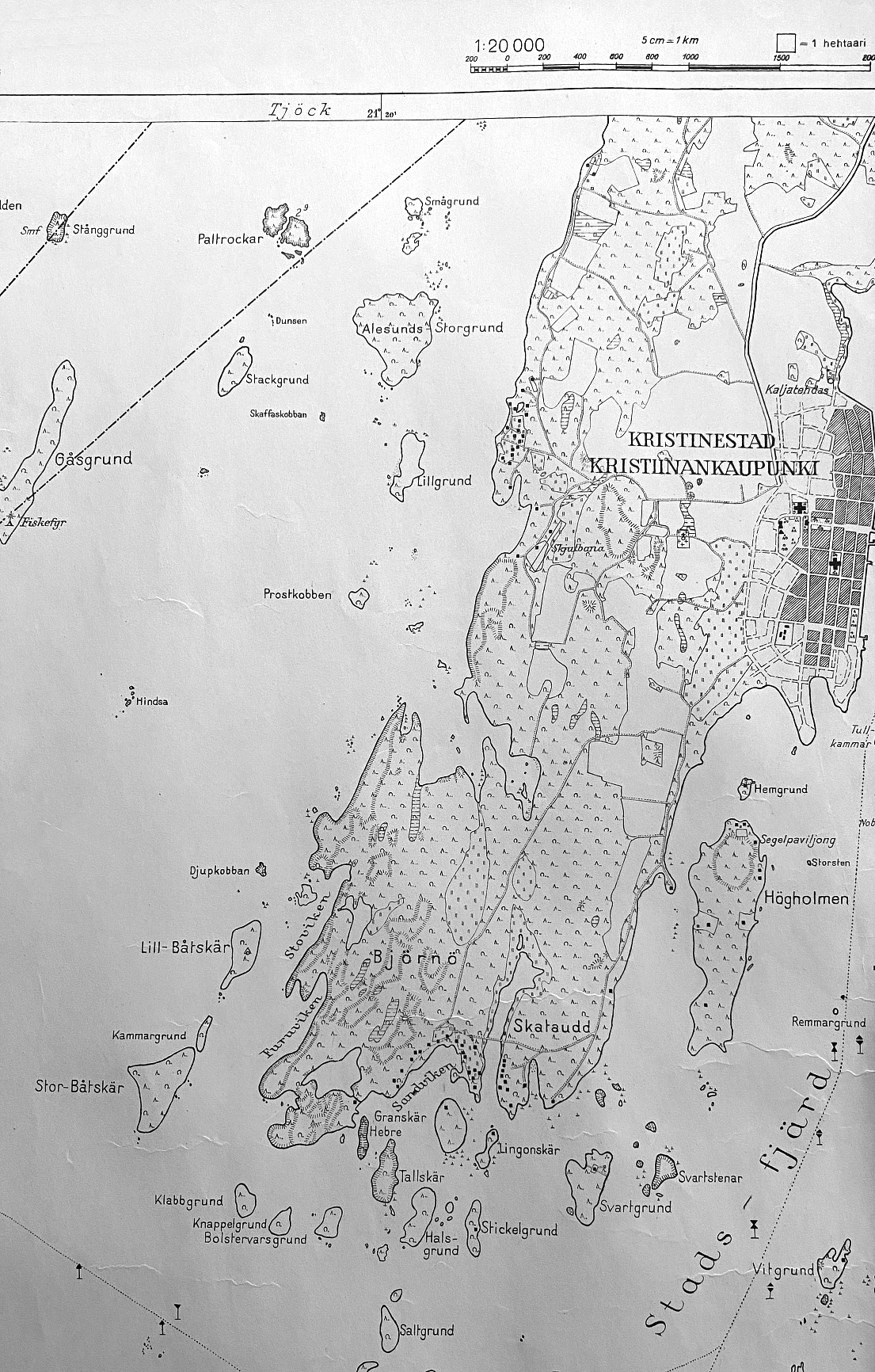 Kartan från Riksarkivet är från 1929.Karta från 1925 med de nya byaråarna utritade med röd färg. Tjöck är överförd till Kristinestad och heter Kristinestads landsförsamling medan staden församling heter Kristinestads stadsförsamling. Mörtmark med Åback hör till Lappfjärds socken trots att det saknas en gemensam gräns. Karta från Riksarkivet.De helgula områdena på kartan från 1921 har en höjd på mellan 0 – 100 m. Brunrandiga områden ligger på mer än 100 meters höjd. Kartan från Riksarkivet.Karta från 1915-1920 som visar var hemmanen fanns i de olika byarna. Karta från Riksarkivet.Handritad rysk karta från den tid som ryska kosacker vistades i Sydösterbotten. Kartan från Landsarkivet i Vasa.Dagens bilister med navigator på instrumentbrädan skulle nog inte klara sig med vägkartan från år 1900. Karta från Riksarkivet.År 1894 fanns det ett förslag i järnvägskommittén att Kristinestad skulle få järnväg. Starka krafter i Kaskö ville att den i stället skulle dras till Kaskö och oenigheten ledde till att ingen av städerna fick järnväg.På kartan från 1875 så ser vi att Tjöck är en del av Lappfjärds socken, medan Sideby, Storå och Bötom är egna socknar. Karta från Riksarkivet.Riksarkivets karta från 1872.Vanhakylä heter Gammelby, Skaftung heter Grankulla och centrum i Lappfjärd heter Håxel på kartan från 1875. Karta från Riksarkivet.”Ristiina” och ”Kaskis” på samma karta, och Närpes kallas för ”Nääräpää” år 1844. Karta från Riksarkivet.Kalmbergs karta från 1856 är välgjord och tydlig. Karta från Riksarkivet.Karta och beskrivning från 1845, som visar det östra brofästet efter stenbrons byggande. A = Lappfjärds sockens och Kauhajoki kapells samfällda krono-bodplan. a = Kauhajoki kapells krono-bodar. b = Lappfjärds sockens krono-bodar. c = Herr Handelsman Nils Sundmans upplagsbodar. d = Herr Consul Wendelins upplagsbodar. e = förfallen färjebrygga. f=nuvarande Stads-Bron. g = nuvarande Landsvägen. h = gamla landsvägen utgörande krono-bodplans rå. Inom krono bodplan A, vid stranden norr om och nära intill färjbryggan e, fanns en mängd plankor tillhöriga herr Handelsman Nils Åkervall, varjämte östra delen av plan emellan bodarna a,b,c vid vägen h fanns fylld med brännvedstravar som uppges tillhöra Tjöck, Påskmark och Lappfjärd byamän av Lappfjärds socken. År 1791 beskrevs bryggan så här på en sockenstämma i Lappfjärd: ”färjebryggan ligger 66 alnar lång och 2 ½ alnar bred, väggar och korsvirke av furu och fylld med sten och grus, å 2 alns djup vid ytterändan”.Christinestad och Kaskö med omkringliggande socknar och byar år 1840. Karta från Riksarkivet.Korsholms södra fögderi eller Christinestad med omnejd 1834. Karta från Riksarkivet.Christinestad omkring 1810-1830. Kartan från Krigsarkivet i Sverige.Vägkarta från 1806. Karta från Riksarkivet.Orter längs kusten år 1803. Karta från Riksarkivet.1800-talskarta med rysk text. Karta från Riksarkivet.Christinestad och den nya staden Kaskö år 1799. Karta från Riksarkivet.Sydösterbotten 1798 med de större vägarna inritade. Karta från Riksarkivet.Fram till 1808-09 års krig var den staden kompakt byggd och den var kringgärdad av ett tullstaket, året runt på land och vintertid också ute på isen. Kartan från Kungliga Konsthögskolan.Handritad karta från 1700-talet. Från Kungliga biblioteket.Översiktskarta över vägnätet i Christinestad och Lappfjärd i början av 1800-talet, efter att nya landsvägen från Lappfjärd till Björneborgs togs i bruk 1802. Kartan lånad från Kungliga Konsthögskolan.På kartan från 1772 finns intressanta byanamn med, liksom de viktigaste vägarna. Kartan från Riksarkivet i Stockholm.Vägnätet i Österbotten i början av 1800-talet, alltså efter att landvägarna från Närpes norrut och från Lappfjärd söderut blivit färdiga. Om du vill läsa en intressant reseberättelse om en färd mellan Vasa och Kristinestad, så skall du klicka HÄR!Vägkarta från 1789 efter att vägen Närpes-Toby stenbro blivit klar. Karta från Riksarkivet.Sjökort från början av 1700-talet. Staden Kaskö som grundades 1785 finns inte med på kartan. Karta från Riksarkivet.En del av Fred. Rönholms karta från 1748. Kartan lånad från Kungliga Konsthögskolan.Christinestad med omnejd 1747. Karta från Riksarkivet.Längs med Per Brahes postväg fanns det milstenar med jämna mellanrum. Sten nr 54 fanns vid Guss hemman i Tjöck och därifrån var det 1/2 mil till Christinestad. Från sten nr 54 i Tjöck var det 3/4 dels mil till sten nr 55 vid Klåvus hemman i Lappfjärd, alltså nuvarande af Hällströms gård. Därifrån var det 7/8 dels mil till Christinestad. Från sten nr 55 i Lappfjärd var det 1 1/2 mil till sten nr 56 vid Teir hemman i Härkmeri. Från stenen 56 i Härkmeri var det 3/4 dels mil till sten nr 57 vid Norrgåls hemman i Skaftung. Från sten nr 57 i Skaftung var det 1 1/8 dels mil till sten nr 58 vid Hansas gård i Sideby. Kartan från mitten av 1700-talet finns på Riksarkivet i Stockholm.Sjökort från 1697. Notera namnet Lappfierden. Sideby hade i tiderna tillhört Ulfsby som låg i området Finland medan Skaftung hörde till Närpes socken i landskapet Österbotten. Gränsen gick vid Rågården, som alltså var gräns mellan Finland och Österbotten. När Lappfjärd år 1607 blev en egen socken ville också Sideby ansluta sig till den nya socknen, främst på grund av den kortare vägen till kyrkan. År 1785 blev Sideby en kapellförsamling under Lappfjärd och först år 1860 blev Sideby en egen socken och fick då med sig byarna Skaftung och Ömossa.På sjökorten från 1697 så syns det bra att landskapen i Södra och Norra Finland låg söder om Lappfjärd och Kristinestad. Området norr om Finland kallades då Österbotten, som på 1500-talet bestod av socknarna Kyro, Närpes, Mustasaari och Pedersöre.Karta från 1650 där planen över Kristinestad fi