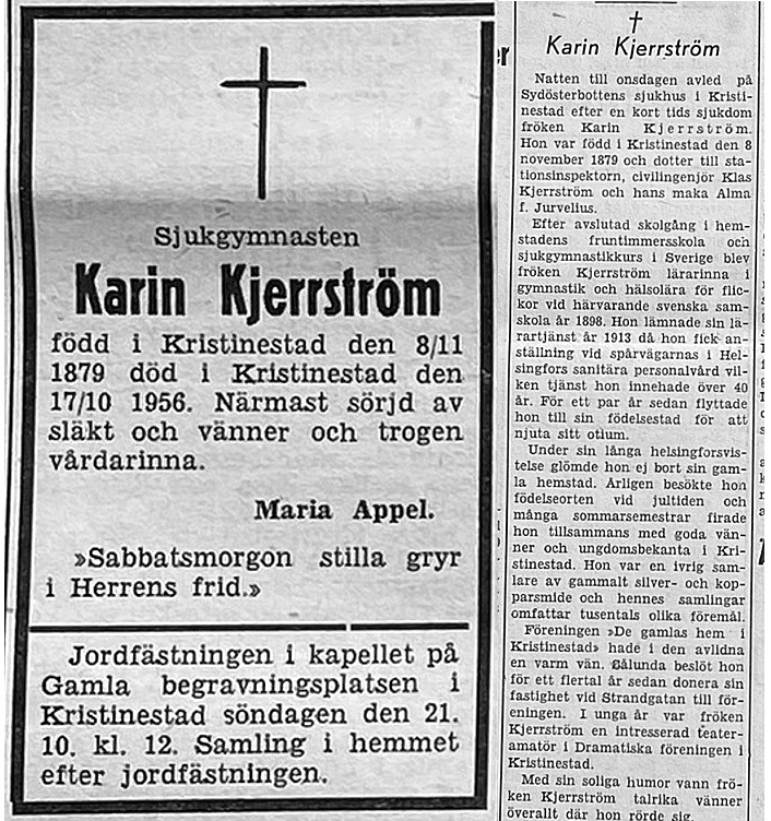 Almas dotter Karin, som var född år 1879 i Helsingfors hade gått i Fruntimmersskolan i Kristinestad, så gick hon en sjukgymnastikkurs i Sverige och år 1896 fick hon tjänst som gymnastik- och hälsolärarinna för flickor i samskolan i Kristinestad. Karin var i unga år intresserad av teater och var ofta med i Dramatiska föreningens teaterföreställningar.
