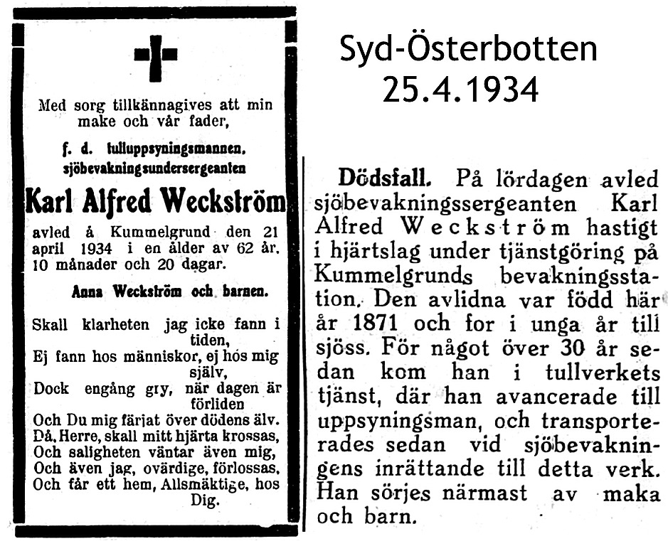 Tulluppsyningsman Karl Alfred Weckström (1871-1934) var son till Karl Johan Weckström (1837-1879) och Margareta Mikander (1839-1906). Han var gift med Kajsa Lillvik (1872-1939) och de fick 8 barn.