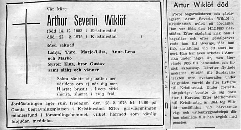 -1883 Arthur Severin, bagare, gift första gången 1909 med Emma Bogren och andra gången 1933 med sjuksköterskan Ida Kosonen (f.1888) från Ruskeala nära Sordavala. År 1935 flyttade han till Sordavala. Båda äktenskapen slutade i ”laglig skilsmässa” och efter kriget flyttade Arthur och Ida tillbaka till Kristinestad. Ida arbetade som sjuksköterska i flera år i staden.