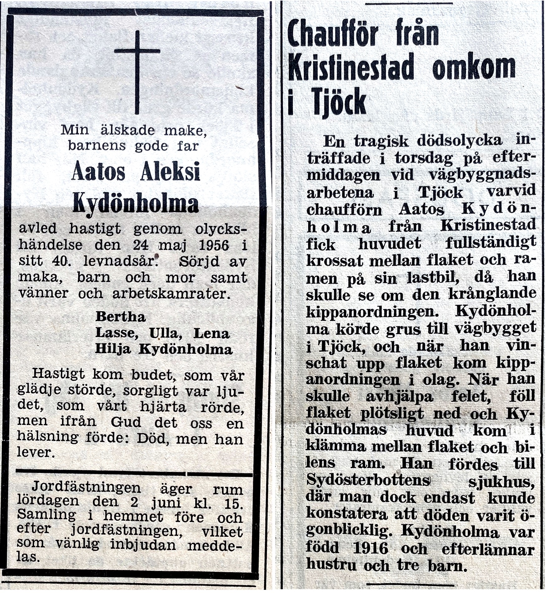 År 1956 i maj blev Bertha änka igen då hennes man Aatos omkom i en olycka. Han arbetade som chaufför på Riksåttans bygge i Tjöck. Med sin lastbil körde han grus till bygget och en dag blev det något fel på kippanordningen. Han gick då under flaken för att åtgärda felet och just då föll flaken ner och Aatos klämdes ihjäl mellan ramen och flaken.