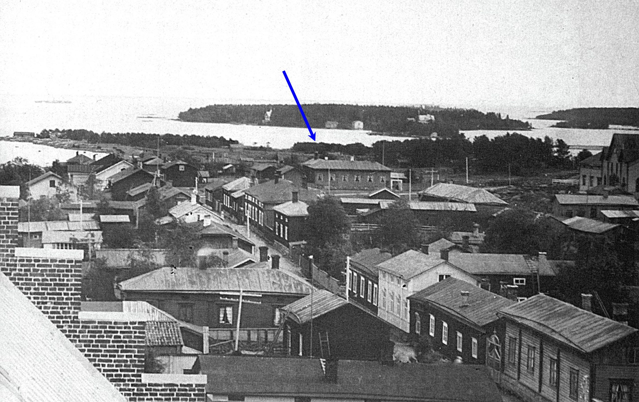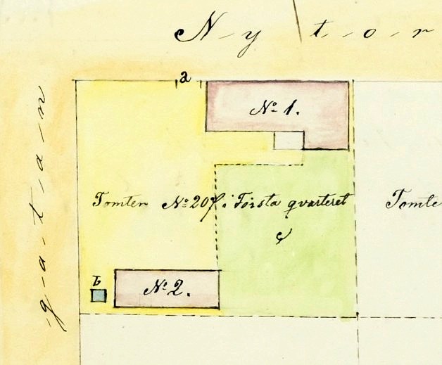 Hugo Sjöbloms gård var uppförd år 1851 och den var placerad i tomtens nordöstra hörn mot Nytorget medan uthuset fanns i det sydvästra hörnet mot Staketgatan.
