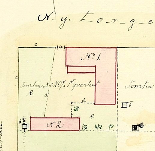 På gården fanns ett uthus som var uppfört år 1852 och det var nästan 18 meter långt och inrymde ett vedlider, lada, fähus och latrin med spillningskast. Runt tomten fanns ett målat plank som var 1,80 meter högt och i planket fanns en inkörsport mot Nytorget, byggd av stockar och plankor. I uthusets ända mot Staketgatan fanns en brunn och en annan brunn fanns på Nytorget i närheten.
