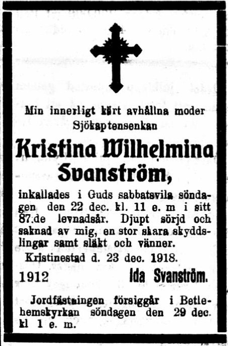 En högtidlig begravning ägde rum senaste söndag i Betlehemskyrkan, då fru Kristina Svanströms kallnade stoft vigdes till gravens ro. Med hennes död den 22 december har ett liv slocknat, avskilt för Guds sak och sina medmänniskors väl. Hon var en ovanligt ren och ädel själ, som längtade att leva för någonting högre, an vad världen ger.