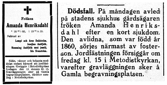 Amanda, som också använde släktnamnet Svanström förblev ogift och barnlös hela livet men omkring 1908 tog hon Arne Dahlström (f.1905) som fosterson och han bodde hos henne tills han blev vuxen.