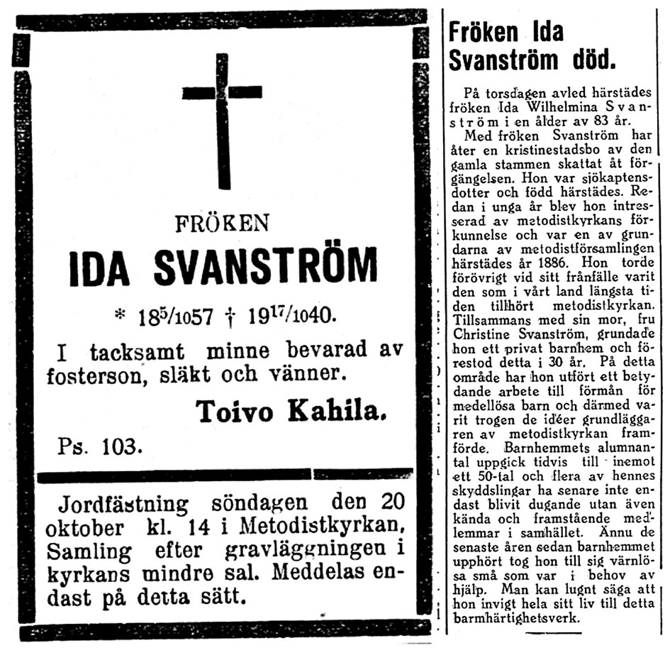 År 1922 fyllde fröken Ida Svanström 65 år och hon var då aktiv i Metodistkyrkan och skötte deras söndagsskola. Hon var också aktiv i nykterhetsföreningen Senapskornet och visat stort intresse för deras arbete.